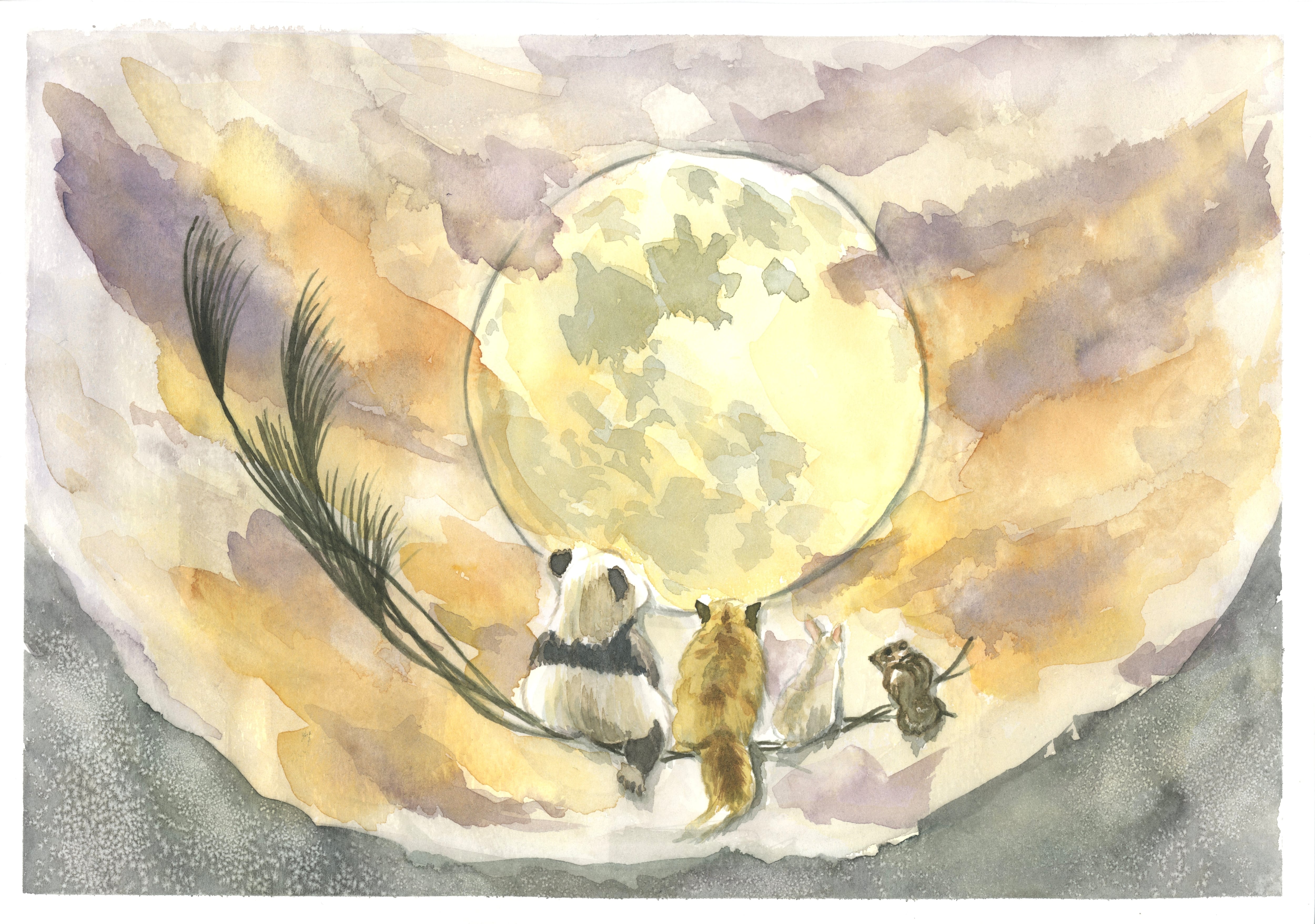 月を見上げる動物たちの後ろ姿には、