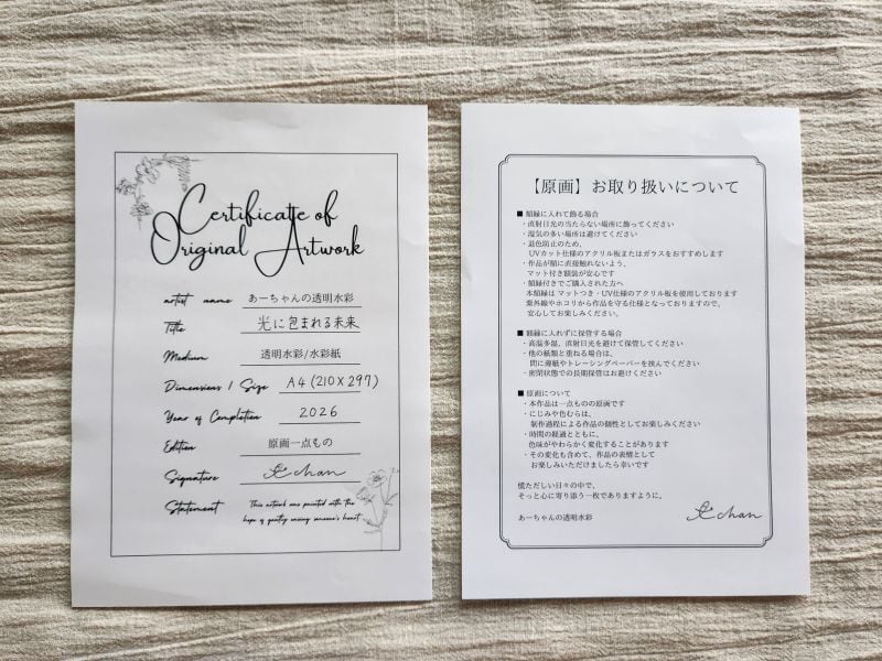 原画取扱説明書・作品証明書をお付けします。